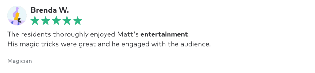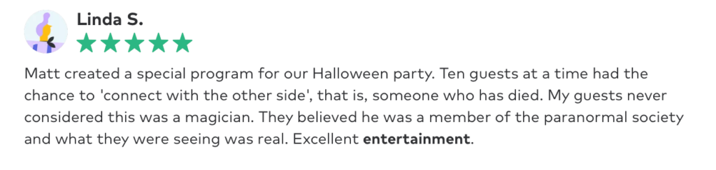 This kind of magic is booked by the hour and is a great fit for a cocktail hour or mixer event. It can also be setup as a station for events with multiple ongoing activities.